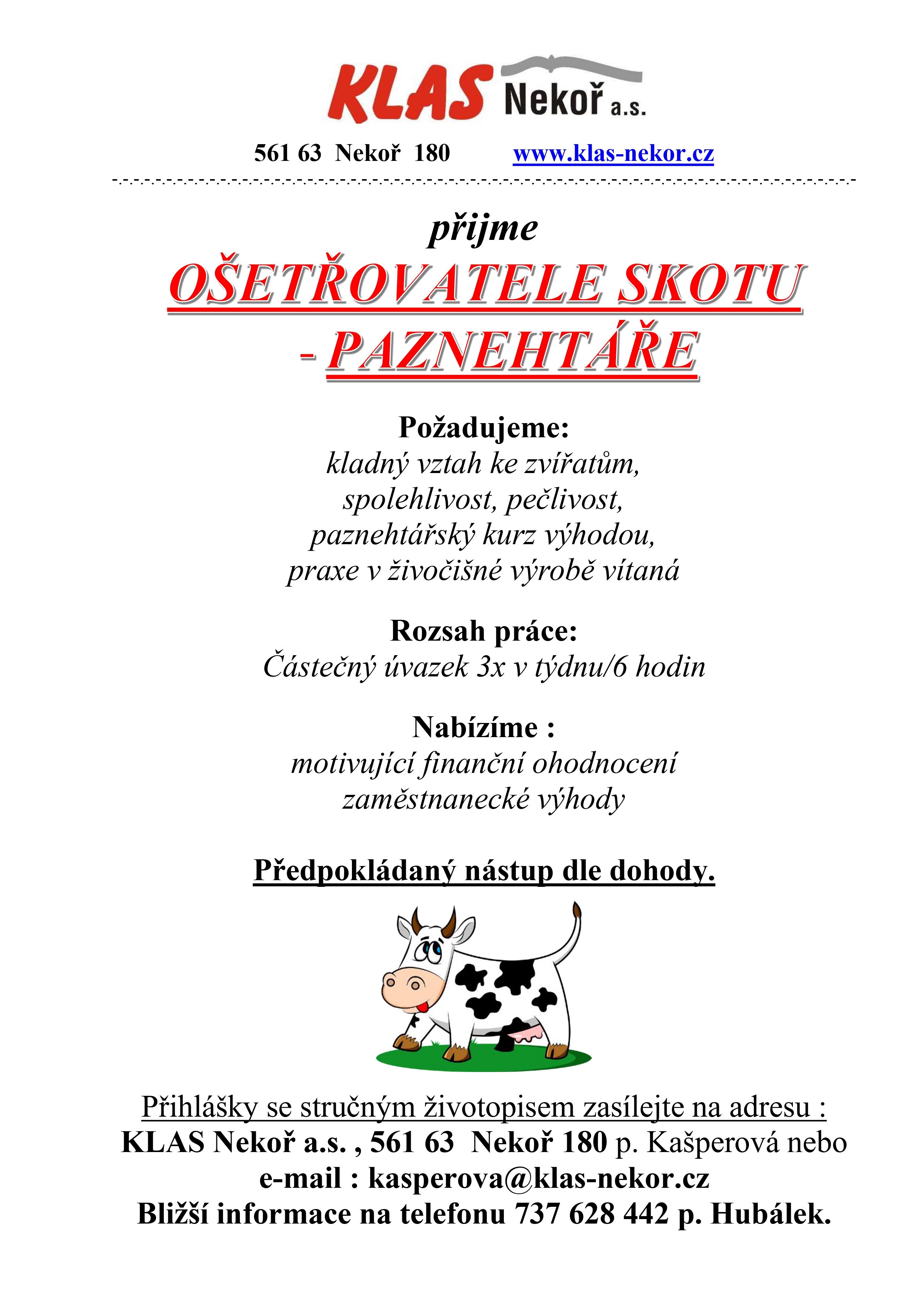 KLAS Nekoř, a.s. - ošetřovatel paznehtů, skotu