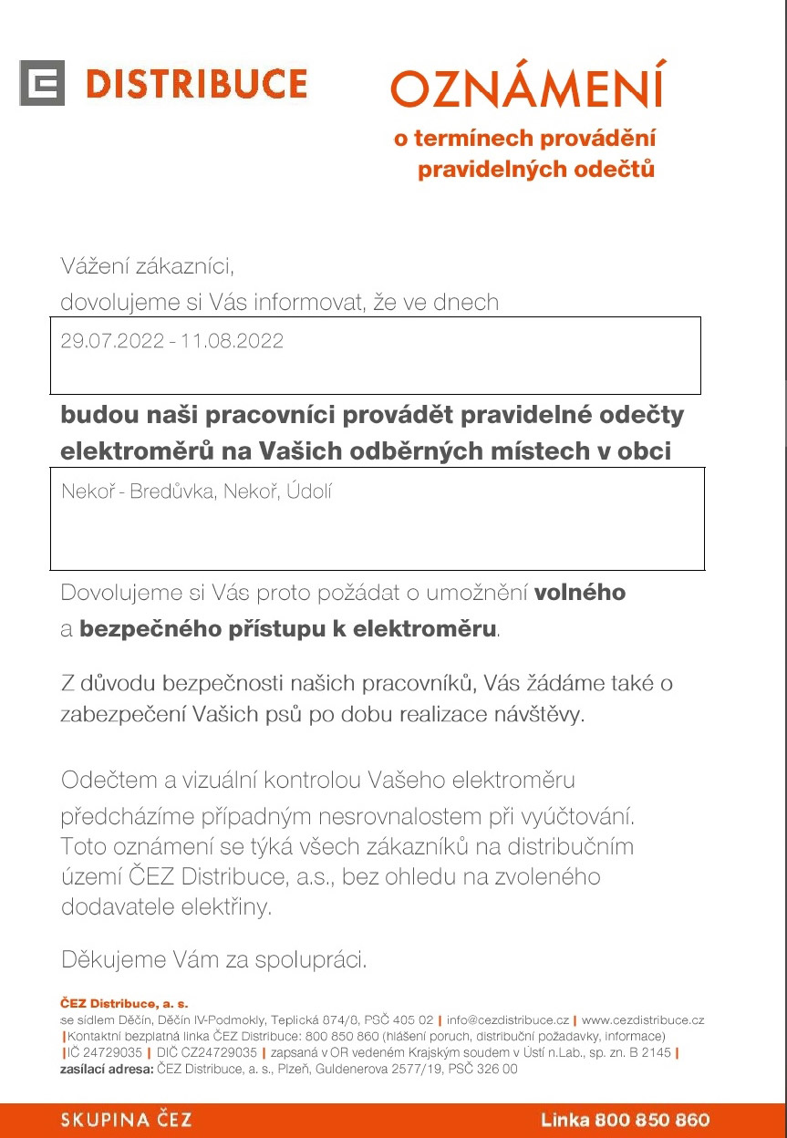 Ve dnech 29.7.2022 - 11.8.2022 budou v obci Nekoř provádět pracovníci ČEZ Distribuce odečty elektroměrů.