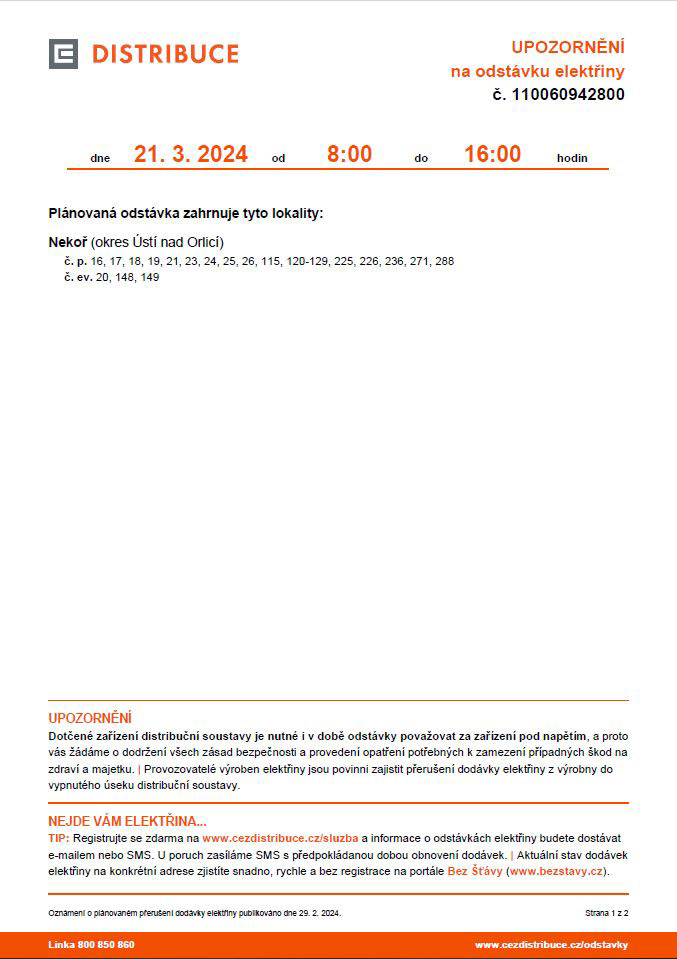 ČEZ DISTRIBUCE, a.s. upozorňuje o přerušení dodávky elektrické energie dne 21. 3. 2024 od 8 do 16 hodin. Dotčená čísla popisná naleznete v příloze tohoto příspěvku.