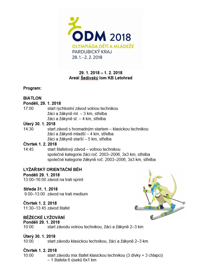 Jde o největší tuzemskou sportovní akci pro starší žáky a žákyně, na které bude více než 1300 dětí bojovat v 11 sportovních disciplínách o 127 sad medailí. Neúspěšnější kraj si odnese pohár pro vítěze. V Letohradu se pojedou závody v biatlonu, běžeckém lyžování a lyžařském orientačním běhu. Podrobnosti o akci a také program je v příloze a na www.olympic.cz/odm.