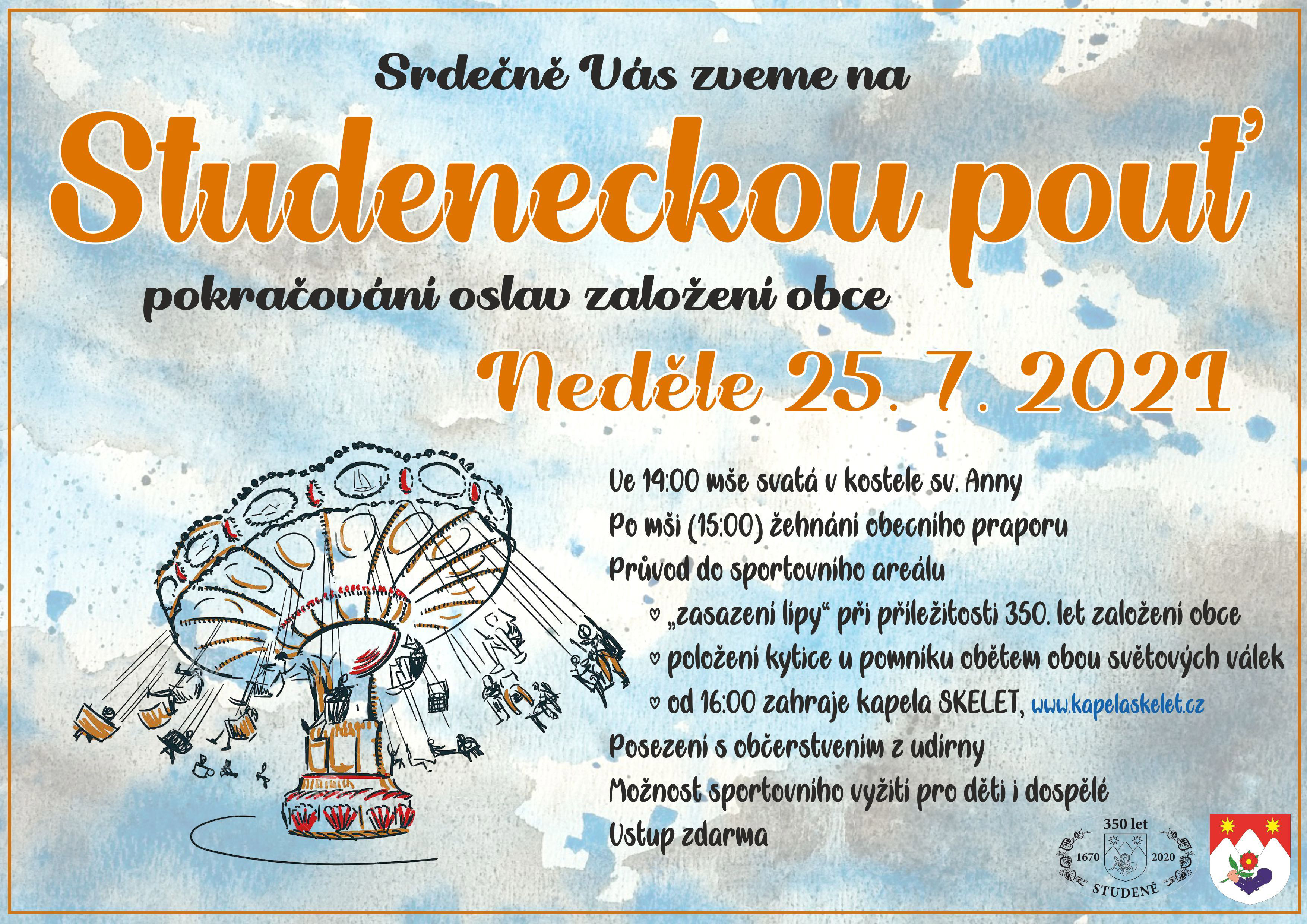 Dne 25. 7. 2021 se ve Studeném v rámci oslav 350. let založení obce, uskuteční žehnání obecního praporu a následné hudební vystoupení kapely SKELET. Více na https://www.studene.cz/aktuality.html