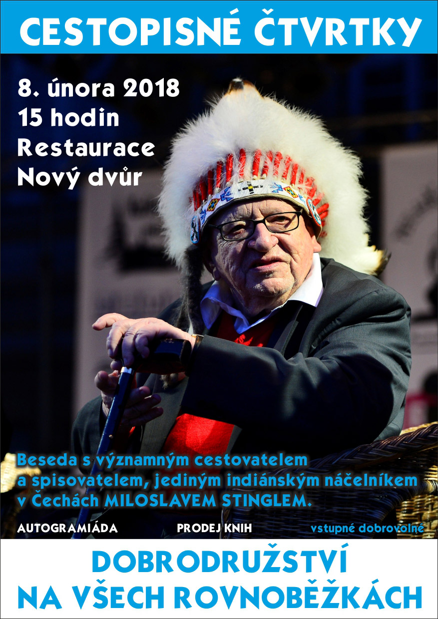 pozor - zajímavé: Příští týden zavítá do Letohradu významný cestovatel, spisovatel a jediný indiánský náčelník v Čechách Miloslav Stingl. Beseda je spojena s autogramiádou a prodejem knih. Cestopisný čtvrtek se koná 8. února 2018 od 15 hodin v Restauraci Nový dvůr