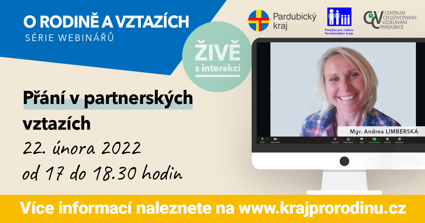 webinář „O rodině a vztazích“, tentokrát na téma PŘÁNÍ V PARTNERSKÝCH VZTAZÍCH, který proběhne v úterý 22. 2. 2022 od 17 hodin s psychoterapeutkou Mgr. Andreou Limberskou.