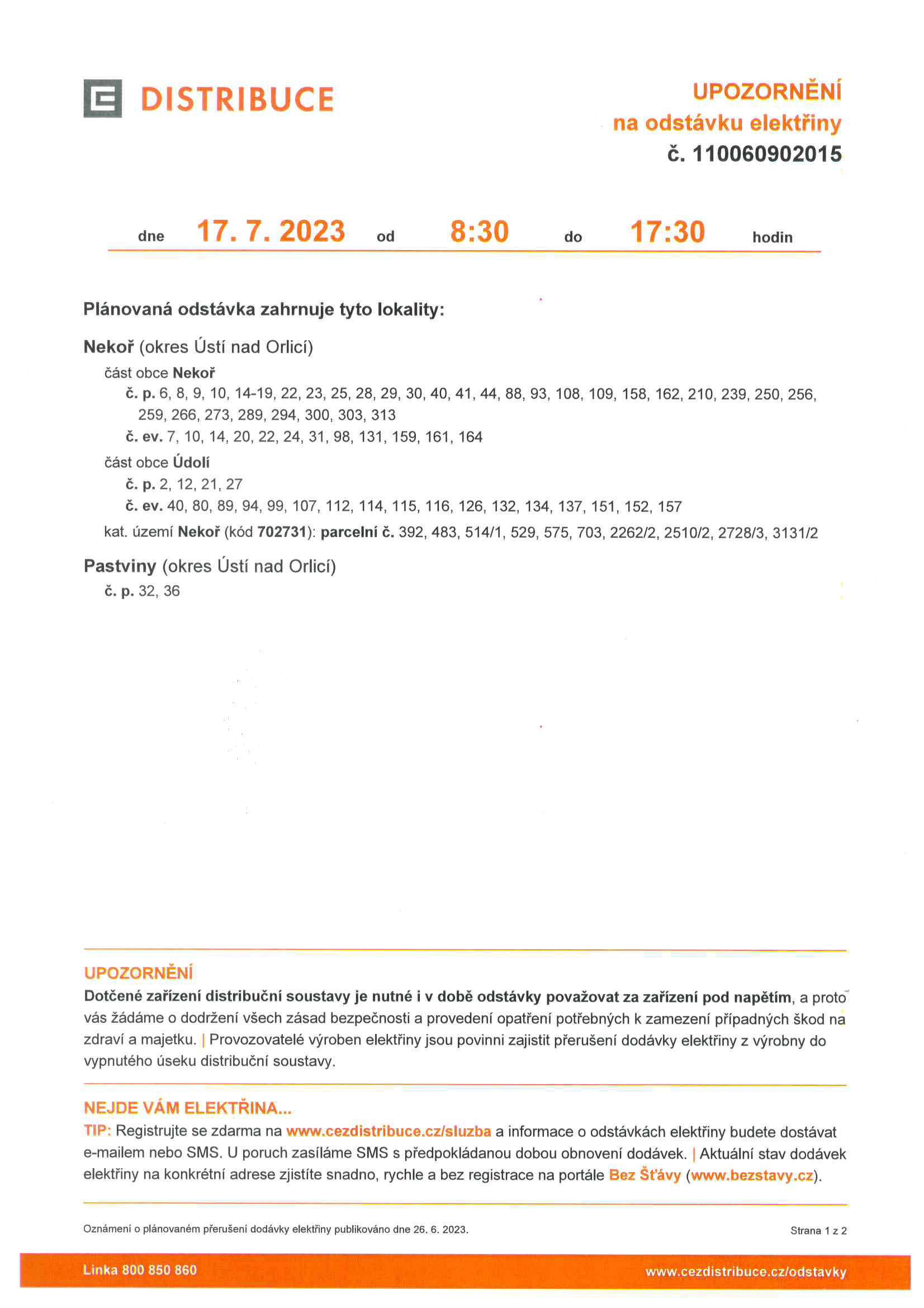 ČEZ Distribuce, a.s. oznamuje, že dne 17. - 18. 7. 2023 od 8:30 do 17:30 dojde k přerušení dodávky elektrické energie. Jakých čísel popisných se odstávka týká, naleznete v příloze tohoto příspěvku.