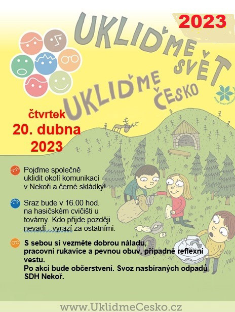 SDH Nekoř a MS Nekoř zvou na akci Ukliďme Česko - čtvrtek 20.4.2023 - sraz v 16,00 u hasičského cvičiště u továrny