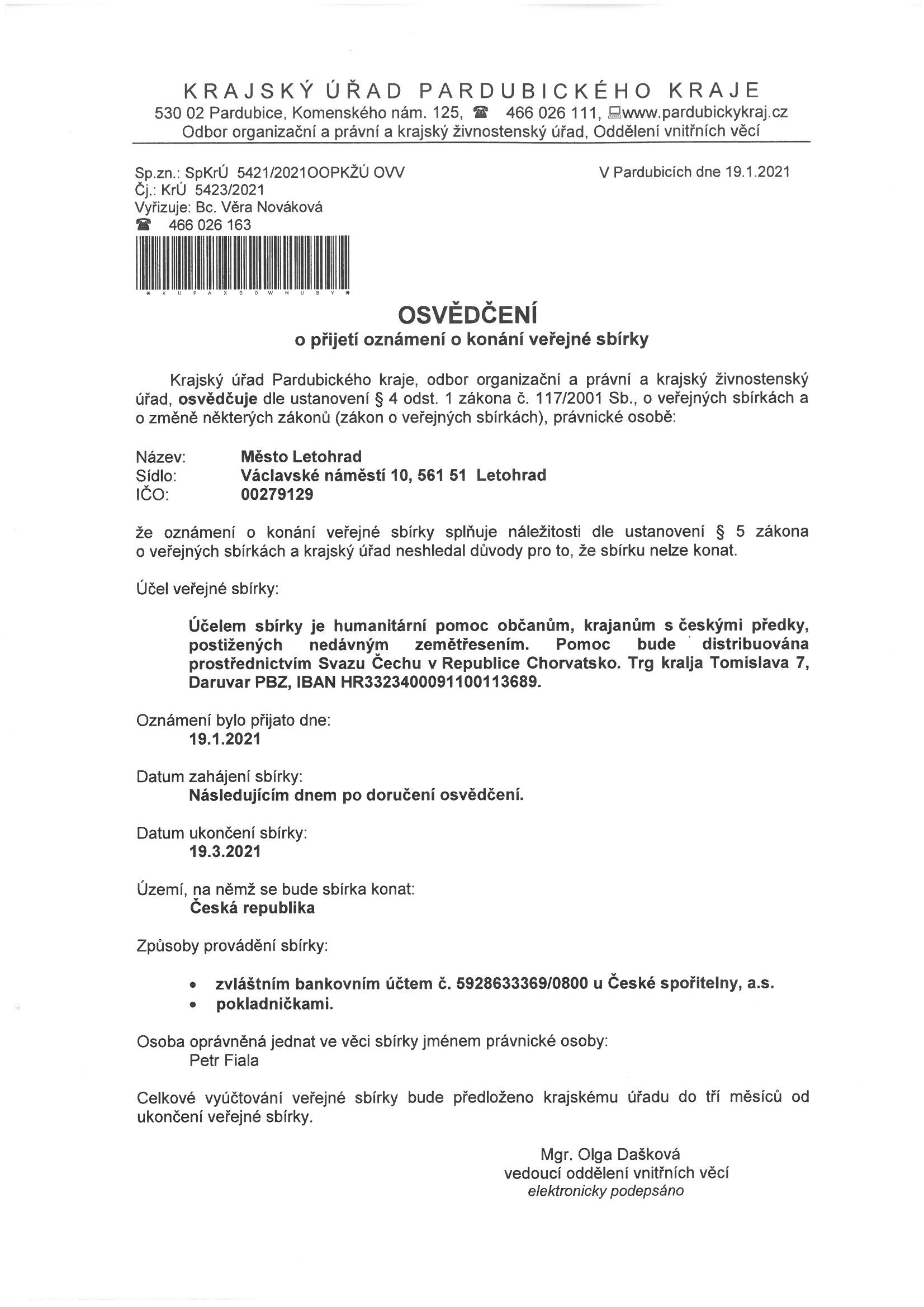 V médiích jste mohli na přelomu prosince a ledna zaznamenat zprávy o sérii zemětřesení v blízkém Chorvatsku (nejvíce zasažená města Petrinja a Sisak). Naše město pojí partnerství s chorvatským Daruvarem, jehož místostarostou je pan Vladimír Bílek, současně poslanec parlamentu pro českou a slovenskou menšinu. Ten se na nás obrátil s prosbou o pomoc, kterou by obdržely prostřednictvím střešní krajanské organizace Svazu Čechů v Chorvatsku se sídlem v Daruvaru právě rodiny s českými kořeny. Jako nejvhodnější byla vyhodnocena veřejná sbírka se zřízením transparentního účtu v České republice. Tu zřídilo město Letohrad.