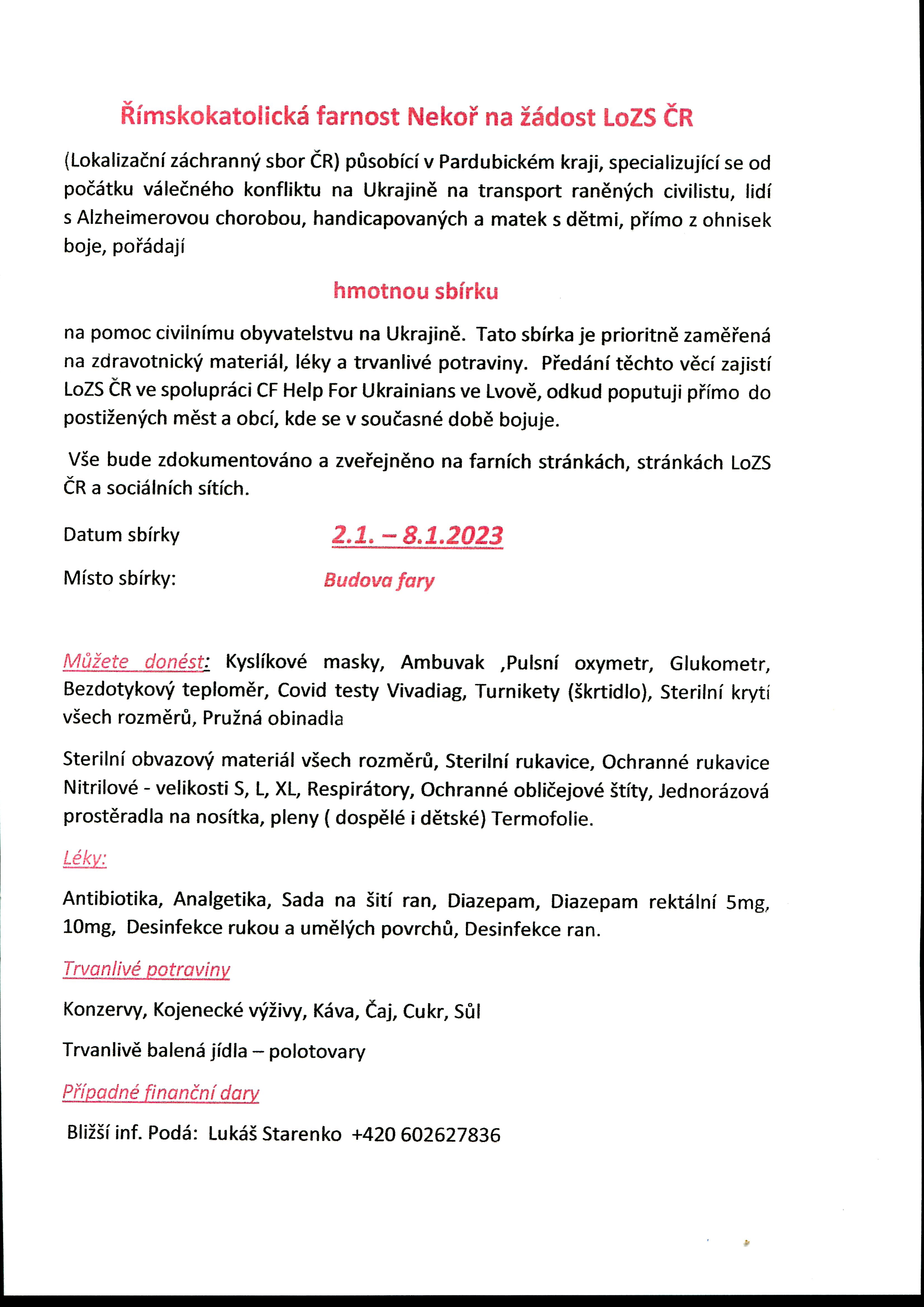 ŘK Farnost Nekoř se připojila k humanitární sbírce pro Ukrajinu pořádné Lokalizačním záchranným sborem ČR . - sbírá se zdravotnický materiál a trvanlivé potraviny. - podrobnosti v příloze
