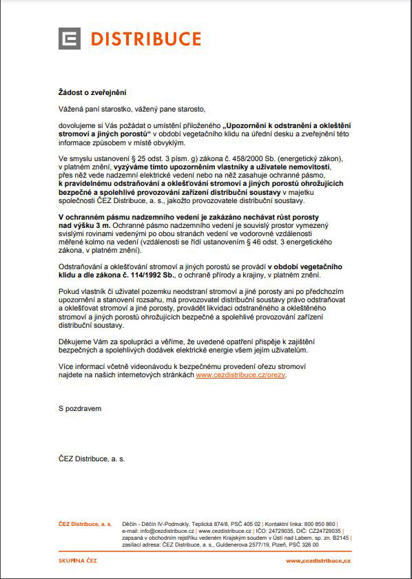 Upozornění k odstranění a okleštění stromoví - ČEZ Distribuce a.s.