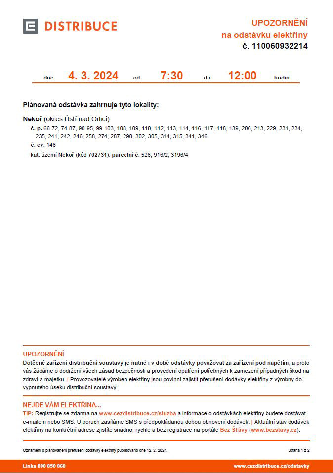 ČEZ Distribuce, a.s. oznamuje přerušení dodávky elektrické energie, které proběhnou ve dnech 22. 2. a 4. 3. Upozorňujeme, že dne 4. 3. dojde k odstávce ve dvou lokalitách. První se týká místní části obce Vejrov (7:30 až 12hodin) a druhá Nekoř (10:30 -15:00).
