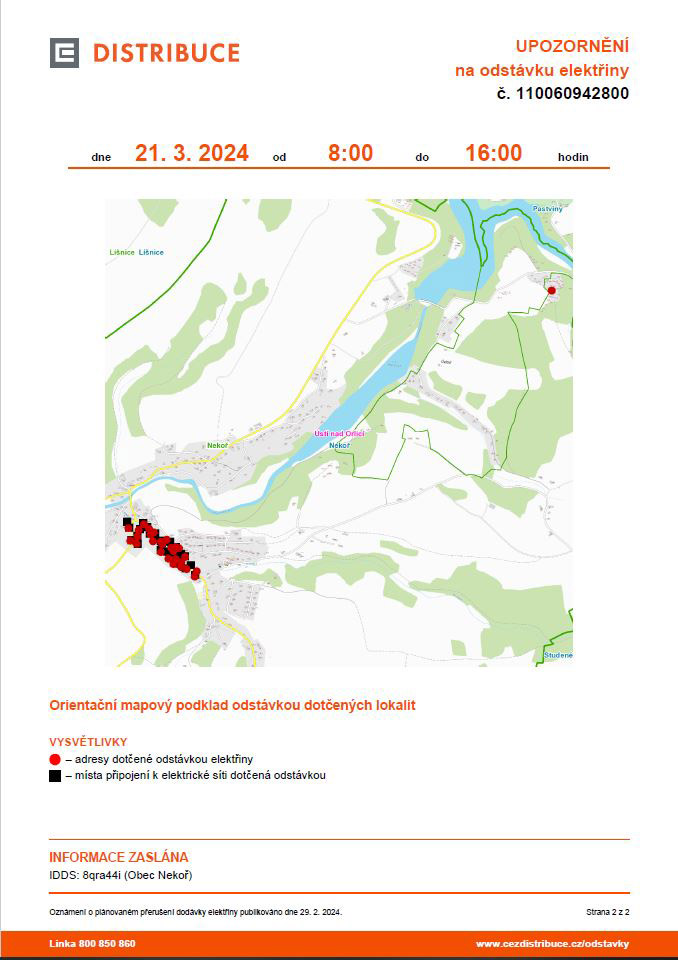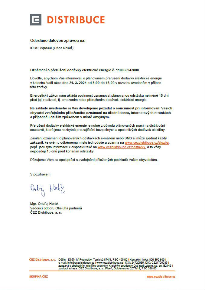 ČEZ DISTRIBUCE, a.s. upozorňuje o přerušení dodávky elektrické energie dne 21. 3. 2024 od 8 do 16 hodin. Dotčená čísla popisná naleznete v příloze tohoto příspěvku.