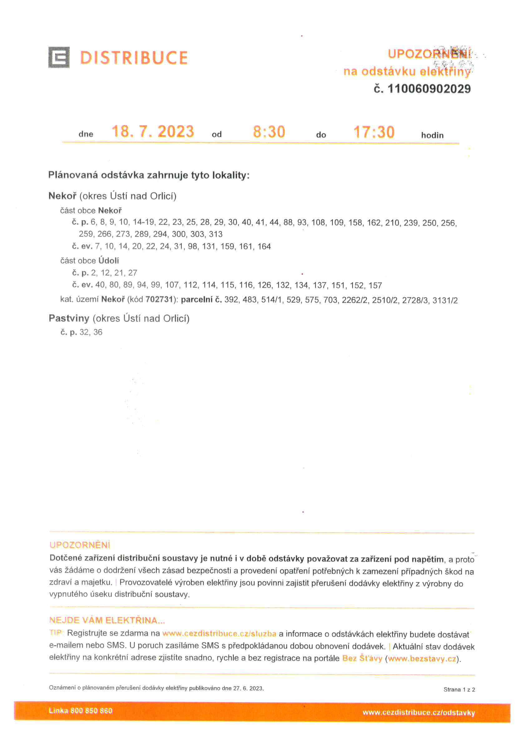 ČEZ Distribuce, a.s. oznamuje, že dne 17. - 18. 7. 2023 od 8:30 do 17:30 dojde k přerušení dodávky elektrické energie. Jakých čísel popisných se odstávka týká, naleznete v příloze tohoto příspěvku.
