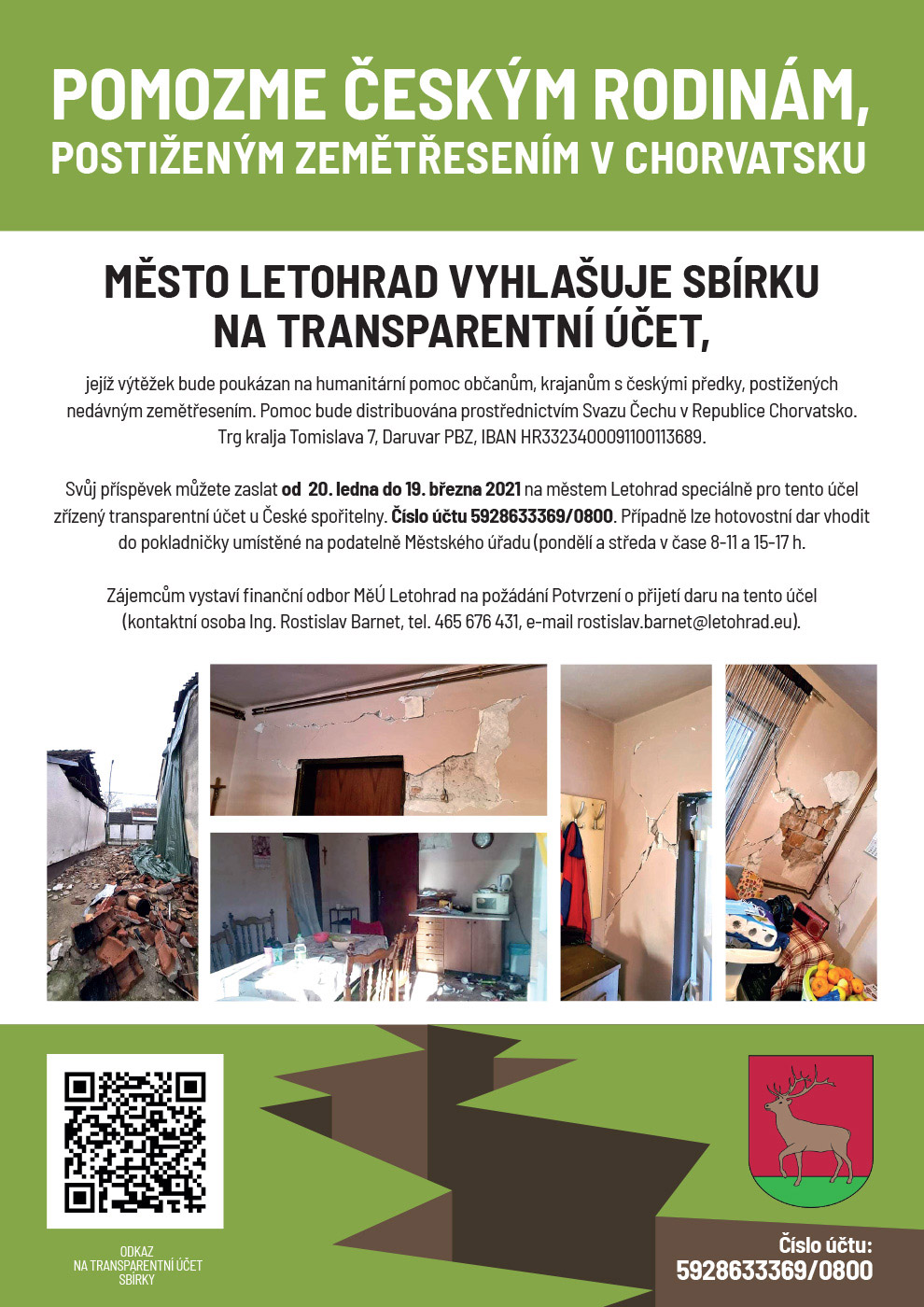 V médiích jste mohli na přelomu prosince a ledna zaznamenat zprávy o sérii zemětřesení v blízkém Chorvatsku (nejvíce zasažená města Petrinja a Sisak). Naše město pojí partnerství s chorvatským Daruvarem, jehož místostarostou je pan Vladimír Bílek, současně poslanec parlamentu pro českou a slovenskou menšinu. Ten se na nás obrátil s prosbou o pomoc, kterou by obdržely prostřednictvím střešní krajanské organizace Svazu Čechů v Chorvatsku se sídlem v Daruvaru právě rodiny s českými kořeny. Jako nejvhodnější byla vyhodnocena veřejná sbírka se zřízením transparentního účtu v České republice. Tu zřídilo město Letohrad.
